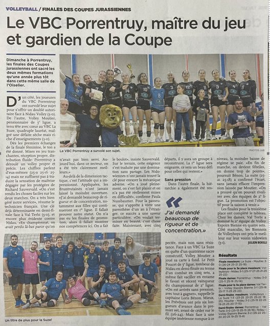 Dernières actualités Les dames du VFM et de VEBB au Final4 de 1L, ce week-end prochain à l’Oiselier à Porrentruy 😍17 mars 2026 Tournoi U14-2 à Bienne : une belle fête du volleyball pour la relève16 mars 2026 Fortunes diverses pour le volleyball jurassien16 mars 2026 Formation d’arbitres / Inscription26 janvier 2026 VFM se sépare de Melanie Cina à la fin de la saison / Article RFJ20 janvier 2026 Prochains matchs N° Date/Heure Equipe A Equipe B Lieu Salle Arbitre 1 Arbitre 2