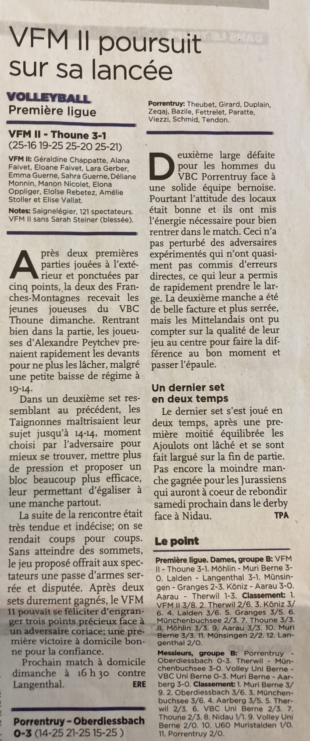 1ère ligue: Le VBC Porrentruy tombe sur un os, VFM II s’en va à Köniz et s’offre le leader