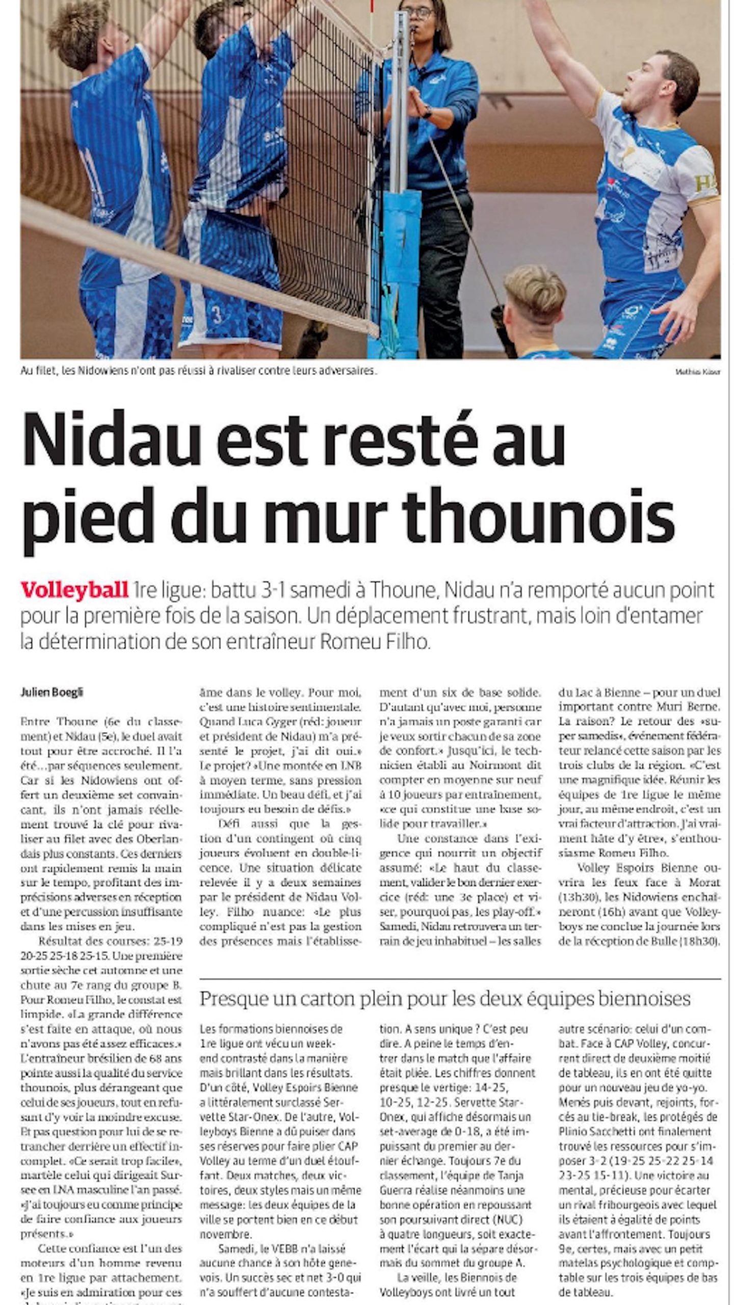 Volley 1re ligue: Nidau est resté au pied du mur thounois. Un week-end presque parfait pour Volley Espoirs Bienne et Volleyboys.