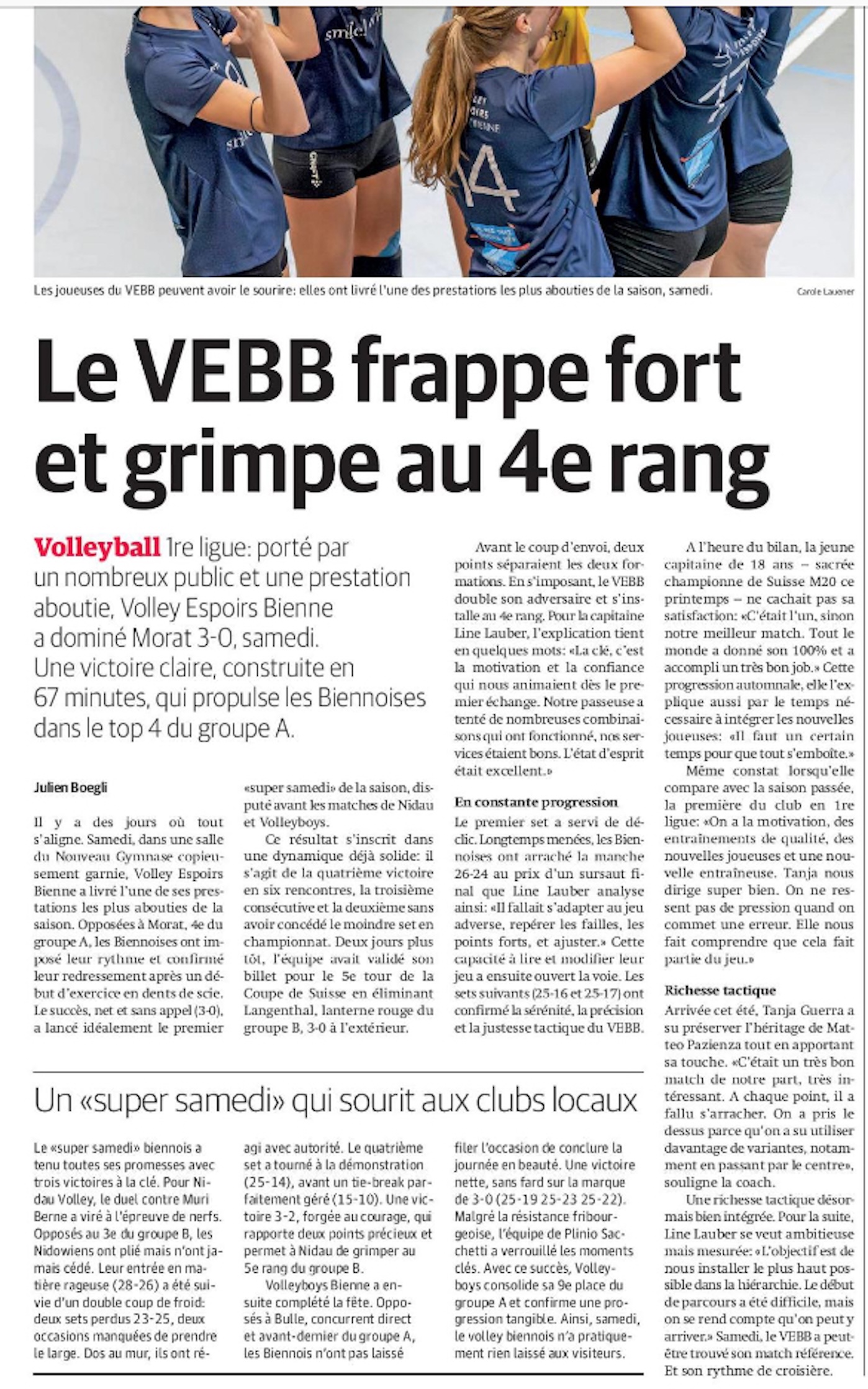Volley 1re ligue: Le VEBB frappe fort et grimpe au 4e rang. Un « super samedi » qui sourit aux clubs locaux