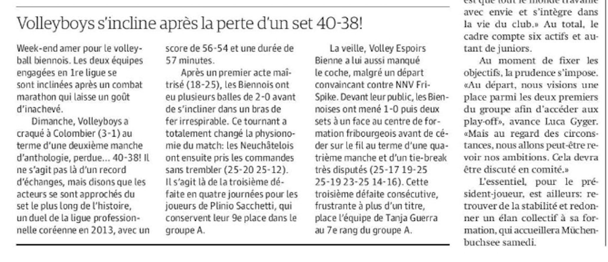 Volley 1re ligue: Volleyboys s’incline après la perte d’un set sur le score de 40-38!