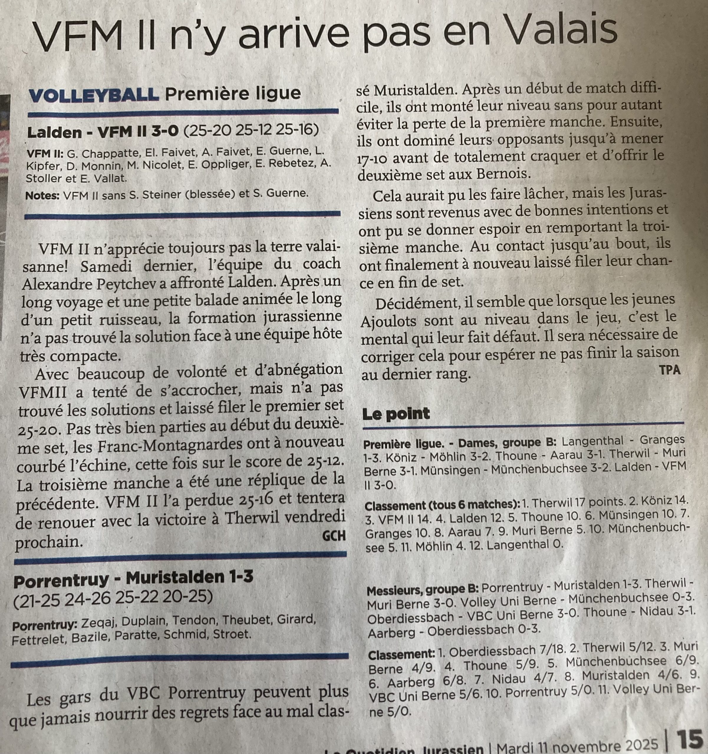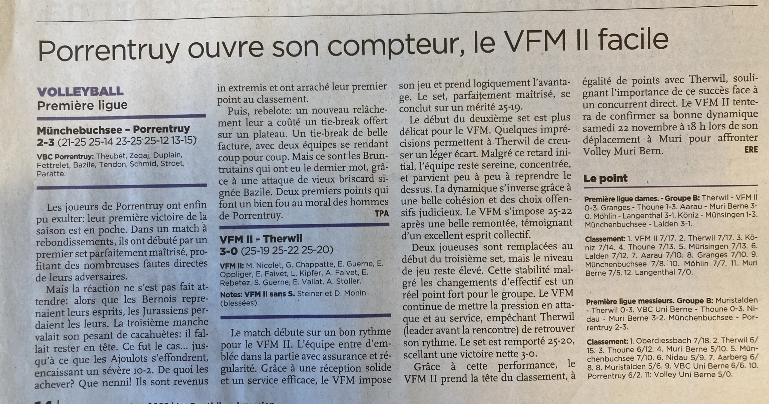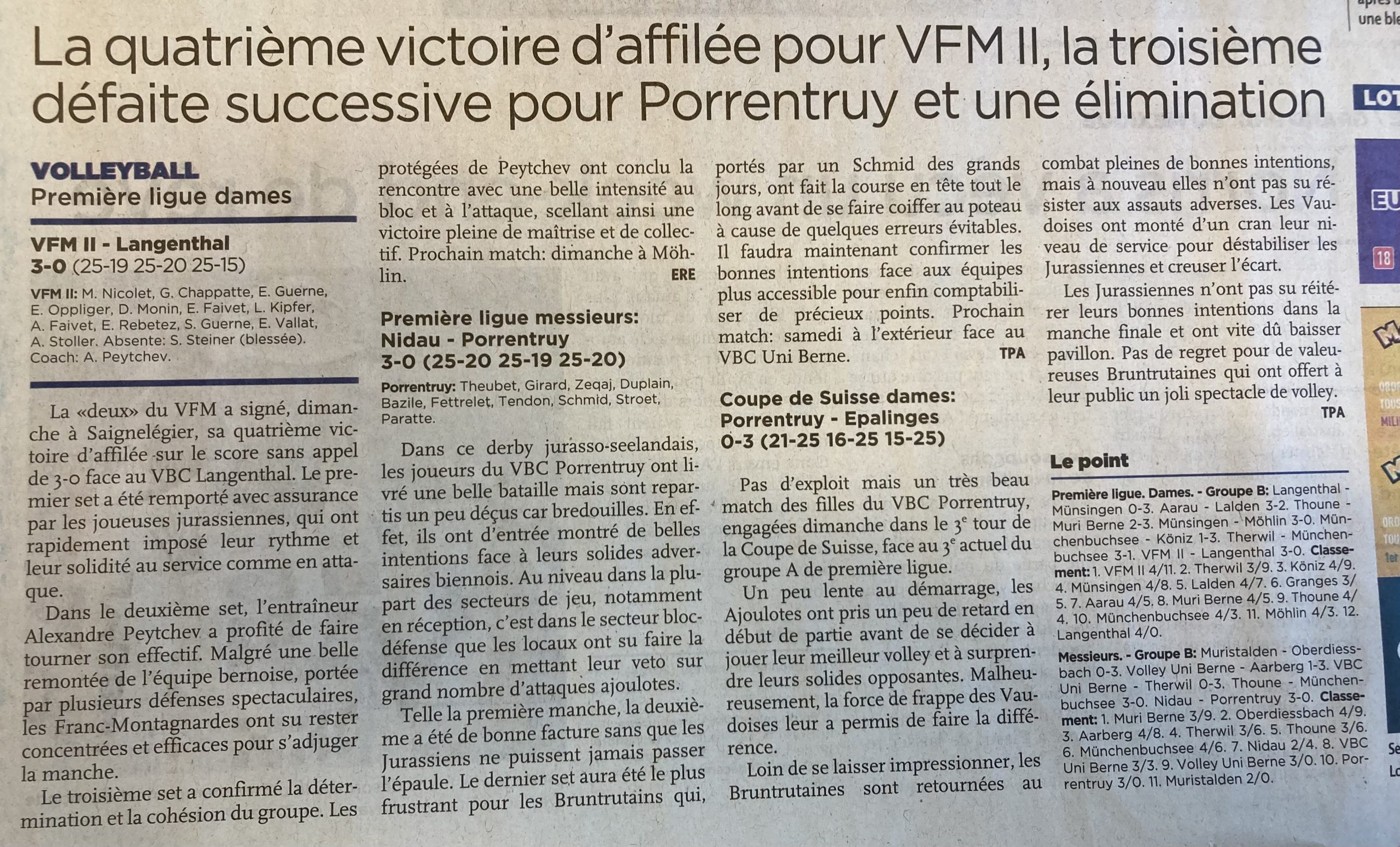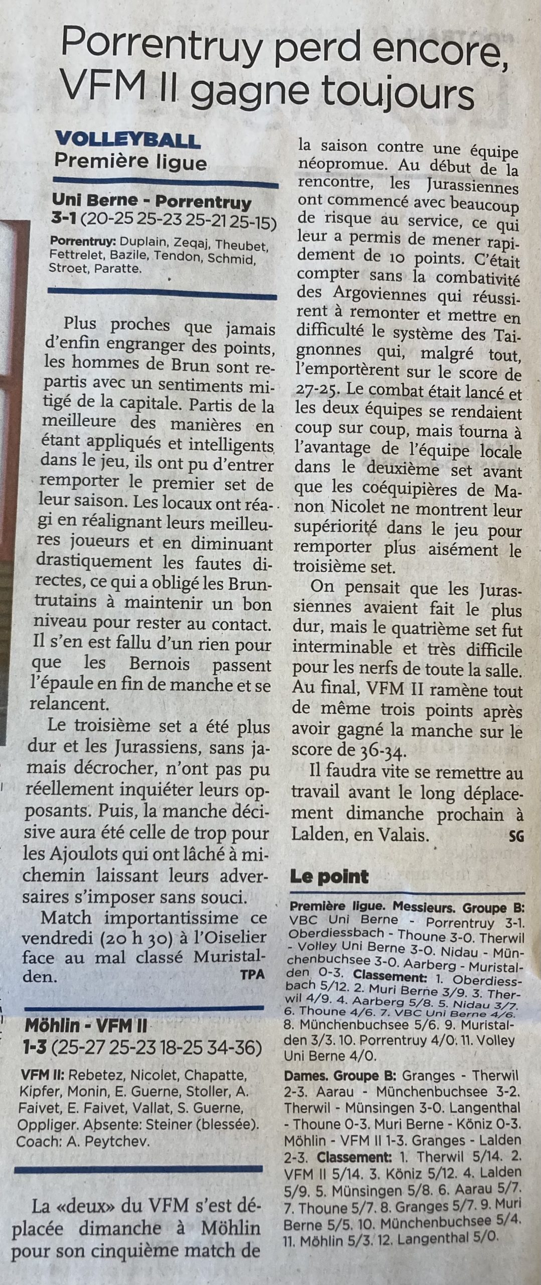 Volley 1re ligue: la quatrième victoire d’affilée pour VFM II, la troisième défaite successive pour Porrentruy et une élimination