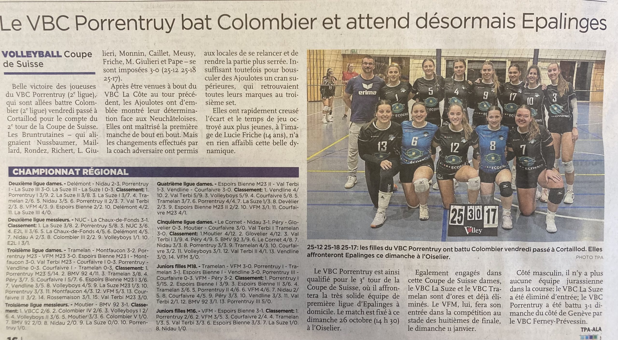 Volley régional: le VBC Porrentruy bat Colombier et attend désormais Epalinges